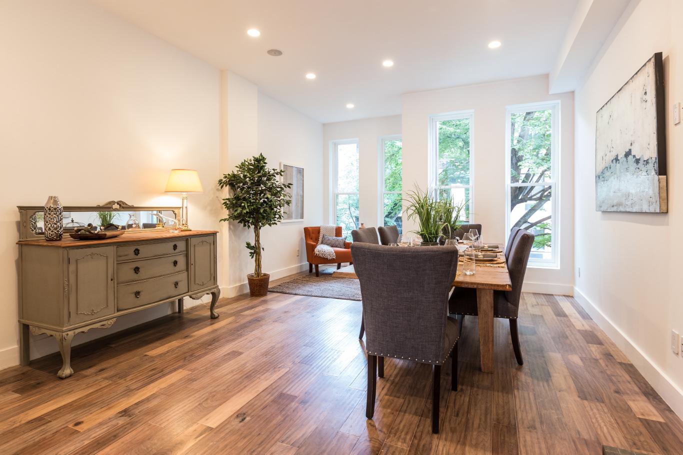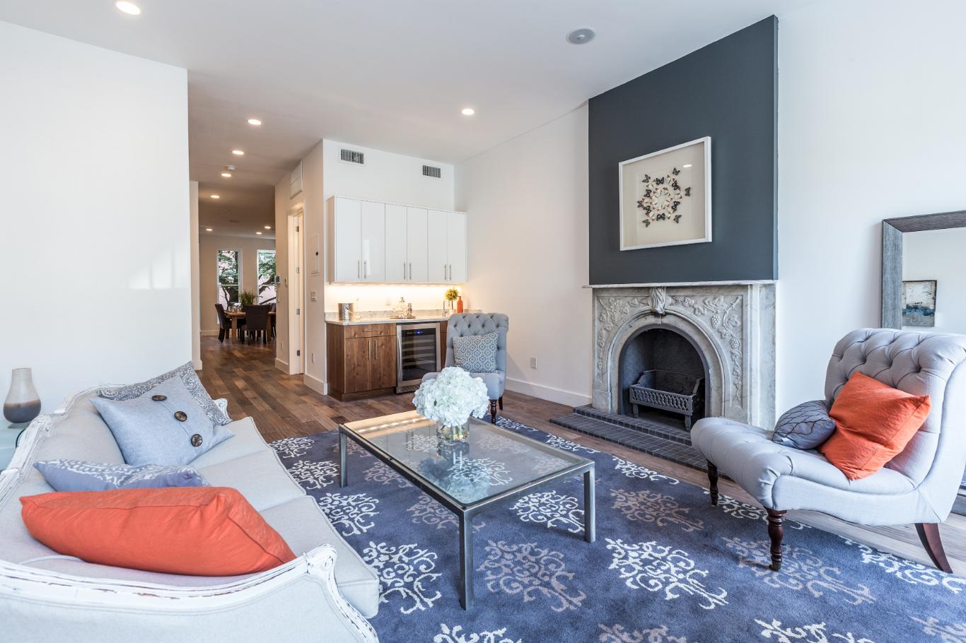 As you open the cast iron gate and walk through the front garden, the house welcomes you into a beautiful first floor foyer assorted with one of the five wood burning fireplaces built with marble mantles: think about the cold/rainy/snowy days of NY and how cozy the feel of coming into a warm house hearing the wood fire cracking noise. Passing the foyer, the house leads you to a fully renovated kitchen featuring a Bertazoni oven and Carrera marble counter tops that opens to a casual dining room with access to the rear garden. In an instant, you can disconnect from the outside and any nuisance you want to escape.
